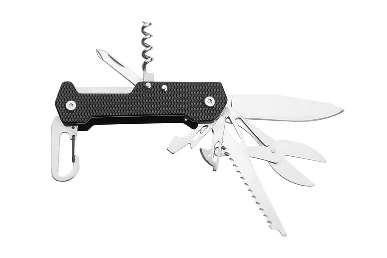 Multifunkční kapesní nůž značky Schwarzwolf. Obsahuje 9 nástrojů – nůž, nůžky, pilku, vývrtku, otvírák lahví, otvírák na konzervy, plochý šroubovák, křížový šroubovák a karabinku. Rukojeť je z jedné strany v moderním vroubkovaném designu, z druhé strany hladká pro umístění Vašeho loga. Baleno v dárkové krabičce. Materiál: nářadí – nerezová ocel 2Cr13, rukojeť – anodizovaný hliník. Rozměry: v zavřeném stavu 9,7 × 2,7 × 1,9 cm. Uhlíková stopa: gCO2 e1727.