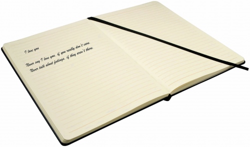 Značkový zápisník JournalBooks formátu A5. Je v pevných deskách z lepenky potažených povrchem imitujícím kůži. Obsahuje 80 linkovaných listů 80 g. Na zadních deskách uvnitř je vlepená roztažitelná kapsa pro drobné poznámky. Baleno v dárkovém obalu JournalBooks. Rozměry: 21,3 × 14,5 × 1,5 cm.
