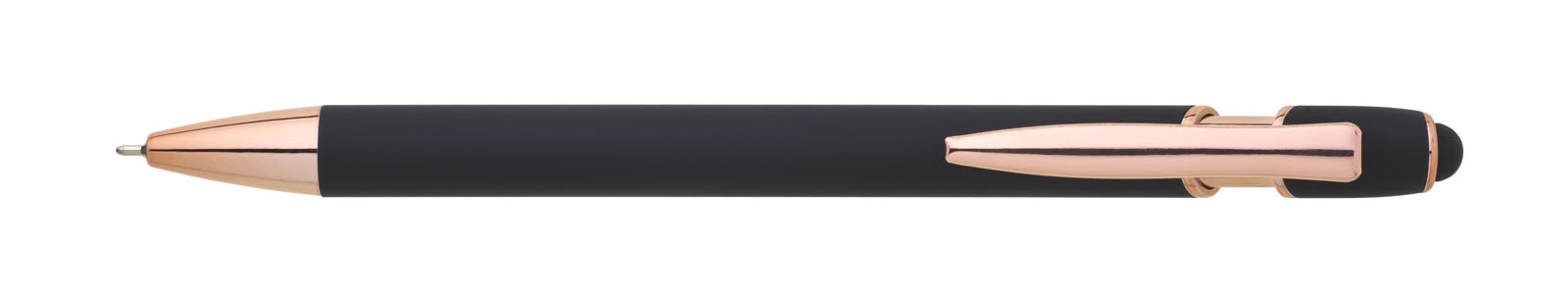 Kovová propiska se soft povrchem, touch koncovkou a doplňky v růžovo-zlaté barvě. Laserované logo je lesklé, růžovo-zlaté. Náplň semigelová, modře píšící.