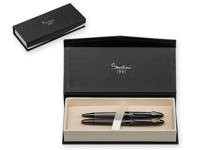 Sada kovové hliníkové propisky a mikrotužky s bílým povrchem a barevným lesklým laserem v barvě horního ukončení propisky. Tělo zdobené dvěma stříbrnými proužky. Sada je nabízena v černé papírové krabičce PORE.