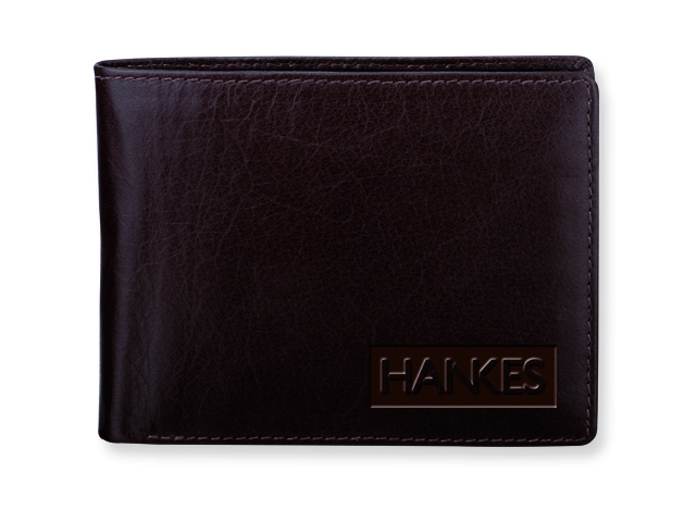 Pánská kožená peněženka v papírové krabičce. 2 kapsy na bankovky, mincovník, 4 kapsy na vizitky a 3 doplňkové kapsy.