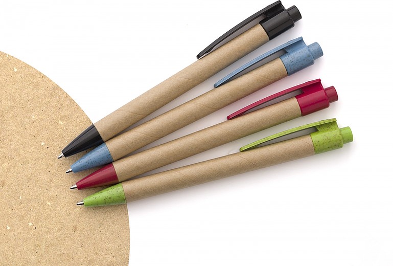 Kuličkové pero z lepenky a pšeničné slámy, s modrým inkoustem. Rozměry: O 1,1 x 14,2 cm.