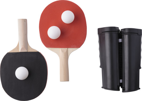 Sada pro stolní tenis, obsahuje 2 pálky, 3 pingpongové míčky a natahovací síťku. Baleno v sáčku z RPET. Rozměry: 30 × 22 x 0,5 cm.