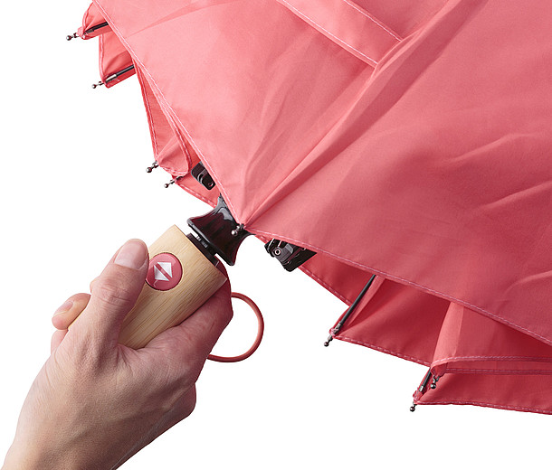 Automatický skládací deštník s 8 panely z RPET materiálu, zapínání na suchý zip, bambusová rukojeť automatické otvírání a zavírání. Obsahuje praktický rukáv. Rozměry: O 97 × 57 cm.