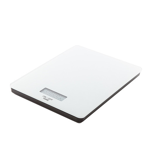 Digitální kuchyňská váha s povrchem z tvrzeného skla vhodná pro celoplošný tisk. Kapacita 5 kg, stupnice 1 g, měrné jednotky g/oz. Rozměr: 150×200×17 mm