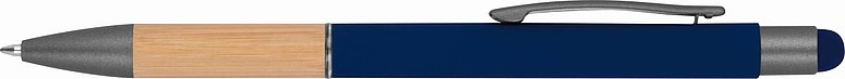Hliníkové kuličkové pero se stylusem a bambusovou rukojetí, modrá náplň. Rozměry: O 1 cm × 14,9 cm.