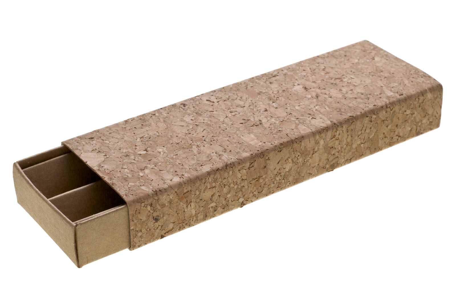 Krabička na 2 propisky z recyklovaného papíru v korkovém přebalu.