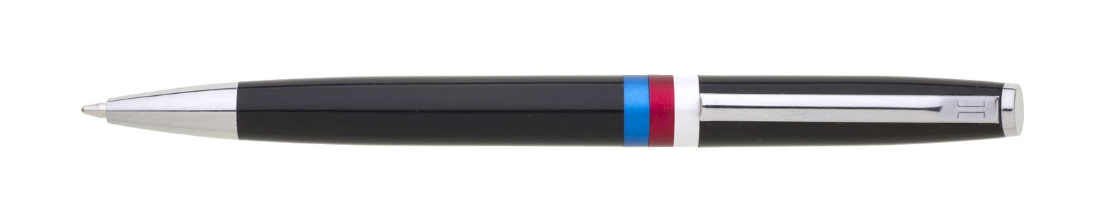 Černá otočná propiska s trikolórou. . Náplň X20, modře píšící.