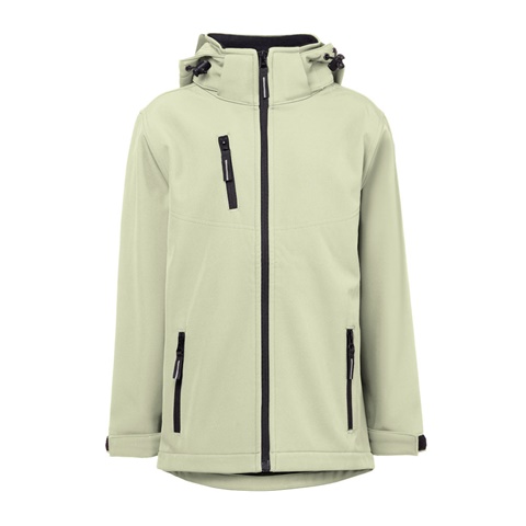 Dětská bunda vyrobená z 96 % recyklovaného polyesterového softshellu a 4 % elastanu (280 g/m²) s dvěma šňůrkami a voděodolnou úpravou. Bunda s podšívkou z fleecového materiálu (100% recyklovaný polyester) se dvěma předními kapsami a diagonální hrudní kapsou, všechny na zip. Kapuce je odnímatelná a nastavitelná pomocí šňůrky a suchého zipu, který ji připne k límci. Přední uzávěr na zip YKK® - značka využívající moderní vybavení a vysokou kontrolu kvality. Manžety jsou nastavitelné s pomocí suchého zipu. Zadní spodní část je zakulacená. Velikosti: 4, 6, 8, 10, 12 Unisex, Our nature