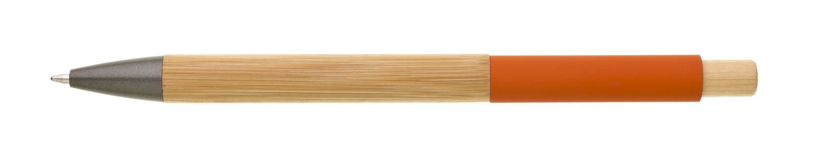 Bambusová propiska s oranžovou hliníkovou částí pod klipem, ideálním pro značení laserem. Náplň X20 modře píšící. Kolekce SAVE THE NATURE.