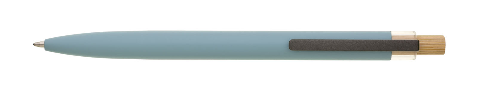 Světle modrá designová kovová propiska z recyklovaného hliníku. Tmavý kovový klip je uchycen v ozdobné transparentní koncovce, doplněné bambusovým klipem. Náplň velkoobsahová, modře píšící. Kolekce SAVE THE NATURE.
