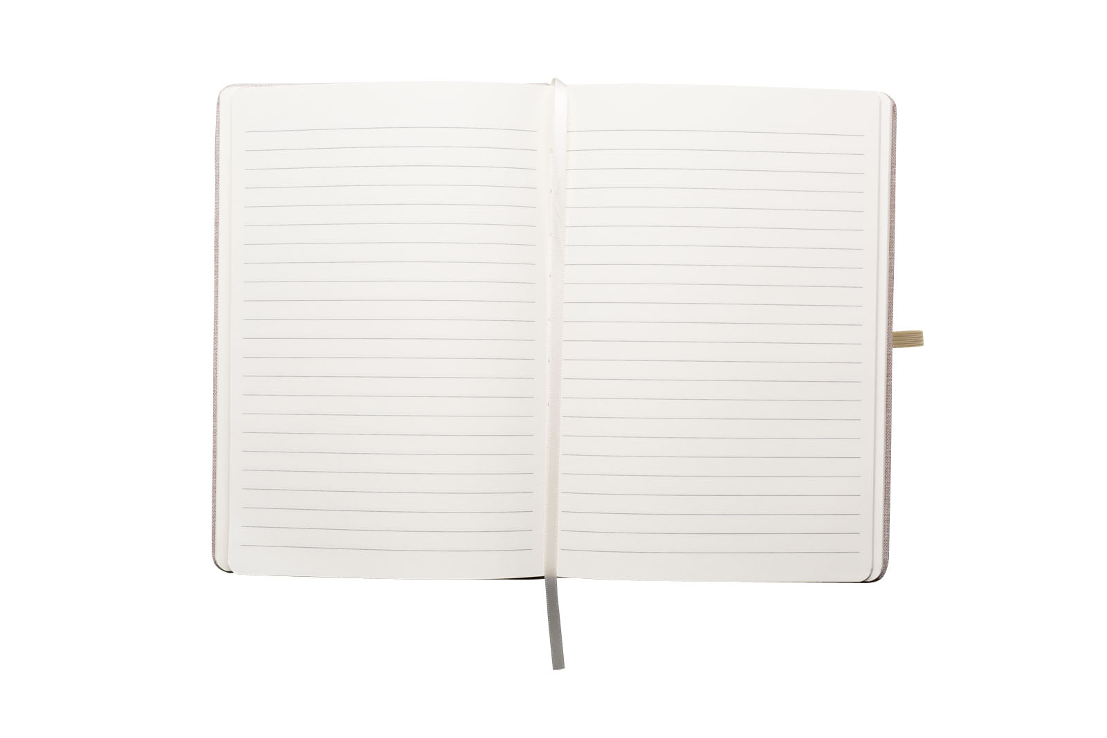 Zápisník A5 v deskách potažených béžovou látkou z recyklované bavlny má 80 linkovaných listů. Blok má uzavírací gumičku, poutko na propisku a textilní záložku v přírodní barvě.
