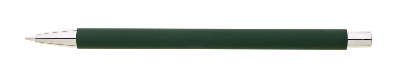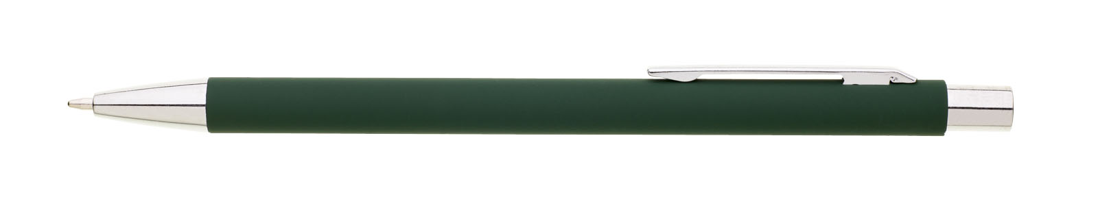 Tenká, jednoduchá propiska se zeleným pogumovaným tělem a chromovými doplňky. Náplň X20, modře píšící.
