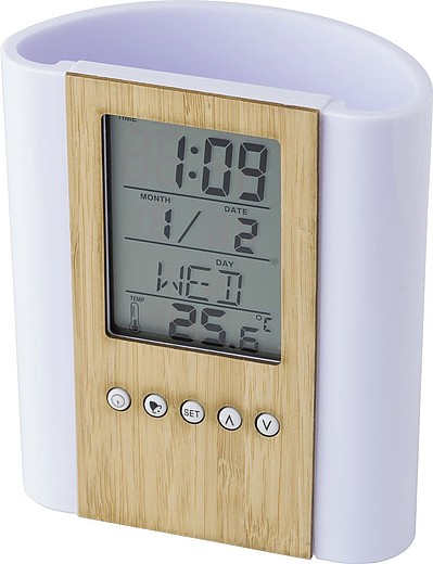 Stojan na tužky z plastu a bambusu s multifunkčními hodinami. Hodiny zobrazují čas, teplotu, datum, budík s odložením zvonění, minutku a připomínku narozenin. Dodáváno včetně baterií. Rozměry: 10 × 5,5 × 12 cm. Cena nezahrnuje recyklační poplatek.