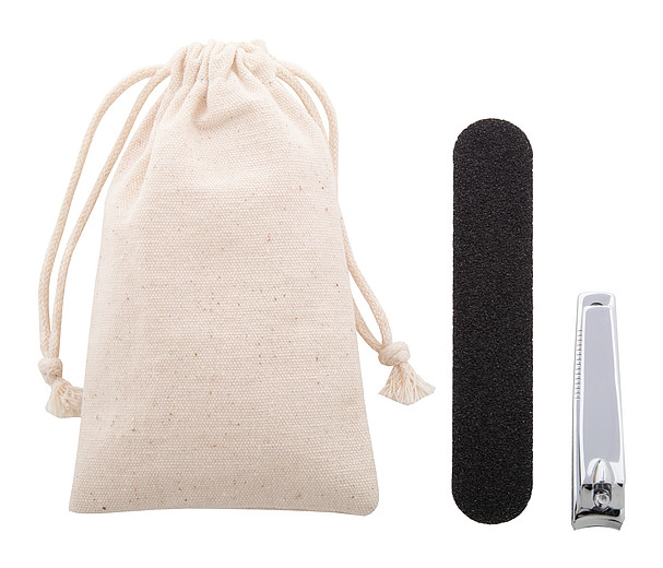 Sada pilníku a kleštiček na nehty v bavlněném stahovacím pytlíku. Rozměr: 75×120 mm