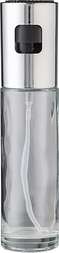Skleněná lahvička se sprejem na olej s plastovým víčkem, objem 100 ml. Dodáváno v hnědé papírové krabičce. Rozměry: 4,2 × 4,2 × 18 cm.