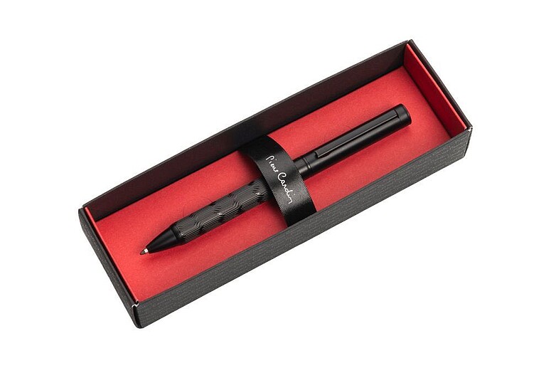 Elegantní značkové kovové kuličkové pero Pierre Cardin, které lze zakoupit zvlášť nebo v sadě. Tělo pera je navrženo v černém provedení s nápaditým strukturovaným designem. Kuličkové pero má otočný mechanismus, obsahuje kvalitní modrou náplň s hrotem 1 mm a je dodáváno s náhradní černou náplní. Baleno v luxusní krabičce, dodáváno s certifikátem pravosti. Rozměry: kuličkové pero 1,1 × 13,8 cm; balení 17,5 × 3,5 × 5,5 cm. Uhlíková stopa: gCO2 e259.