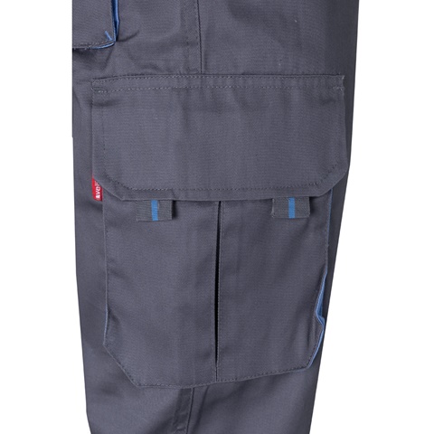Dvoubarevné keprové kalhoty s mnoha kapsami (200 g/m²), z bavlny (35 %) a polyesteru (65 %). S elastickým pasem a kontrastní barvou na klínech, stahování a prošívání. Obsahuje šest kapes: (2 francouzské kapsy, 2 boční klínové kapsy a 2 zadní klínové kapsy). Velikost: 34, 36, 38, 40, 42, 44, 46, 48, 50, 52, 54, 56, 58, 60