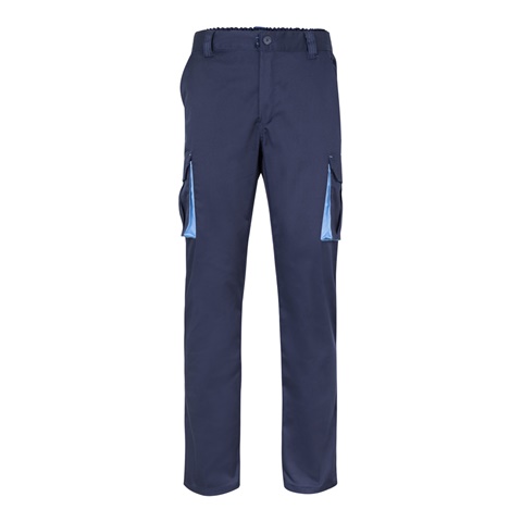 Dvoubarevné keprové kalhoty s mnoha kapsami (200 g/m²), z bavlny (35 %) a polyesteru (65 %). S elastickým pasem a kontrastní barvou na klínech, stahování a prošívání. Obsahuje šest kapes: (2 francouzské kapsy, 2 boční klínové kapsy a 2 zadní klínové kapsy). Velikost: 34, 36, 38, 40, 42, 44, 46, 48, 50, 52, 54, 56, 58, 60