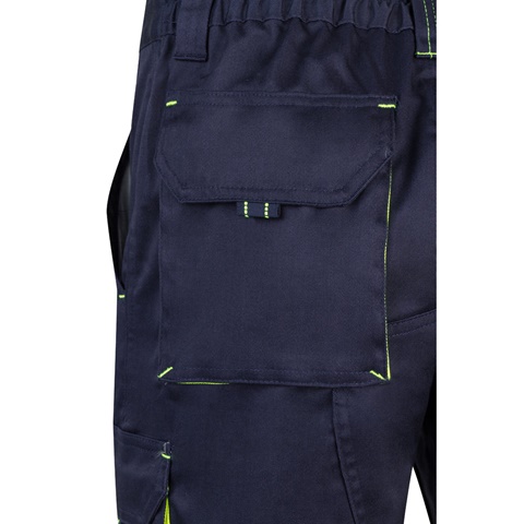 Dvoubarevné strečové bermudy s více kapsami (240 g/m²), z bavlny (46 %), EME (38 %) a polyesteru (16 %). S elastickým pasem, kontrastní barvou na klínech, stahovacím poutkem a prošíváním a látkovým zesílením vzadu. Obsahuje šest kapes (2 francouzské kapsy, 2 boční klínové kapsy a 2 zadní klínové kapsy). Velikost: 34, 36, 38, 40, 42, 44, 46, 48, 50, 52, 54, 56, 58, 60