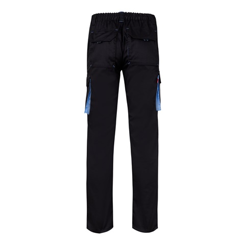 Dvoubarevné strečové kalhoty s mnoha kapsami (240 g/m²), z bavlny (46 %), EME (38 %) a polyesteru (16 %). Slim Fit, elastický pas a kontrastní barva na klíncích, stahování a prošívání. Obsahuje šest kapes (2 francouzské kapsy, 2 boční klínové kapsy a 2 zadní klínové kapsy). Velikost: 34, 36, 38, 40, 42, 44, 46, 48, 50, 52, 54, 56, 58, 60