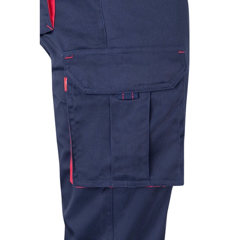 Dvoubarevné strečové kalhoty s mnoha kapsami (240 g/m²), z bavlny (46 %), EME (38 %) a polyesteru (16 %). Slim Fit, elastický pas a kontrastní barva na klíncích, stahování a prošívání. Obsahuje šest kapes (2 francouzské kapsy, 2 boční klínové kapsy a 2 zadní klínové kapsy). Velikost: 34, 36, 38, 40, 42, 44, 46, 48, 50, 52, 54, 56, 58, 60