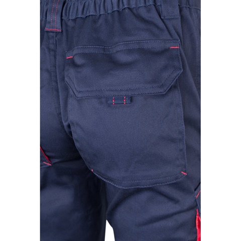 Dvoubarevné strečové kalhoty s mnoha kapsami (240 g/m²), z bavlny (46 %), EME (38 %) a polyesteru (16 %). Slim Fit, elastický pas a kontrastní barva na klíncích, stahování a prošívání. Obsahuje šest kapes (2 francouzské kapsy, 2 boční klínové kapsy a 2 zadní klínové kapsy). Velikost: 34, 36, 38, 40, 42, 44, 46, 48, 50, 52, 54, 56, 58, 60