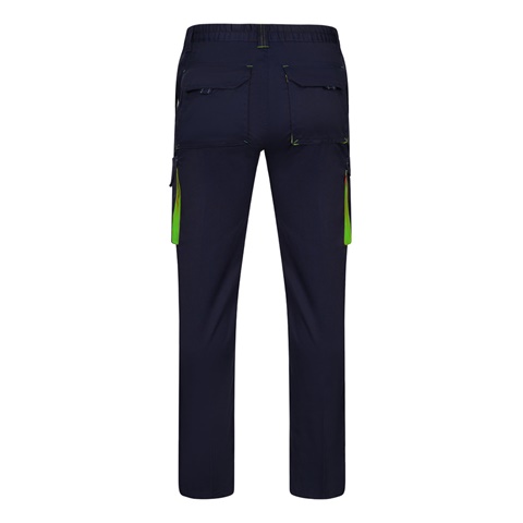 Dvoubarevné strečové kalhoty s mnoha kapsami (240 g/m²), z bavlny (46 %), EME (38 %) a polyesteru (16 %). Slim Fit, elastický pas a kontrastní barva na klíncích, stahování a prošívání. Obsahuje šest kapes (2 francouzské kapsy, 2 boční klínové kapsy a 2 zadní klínové kapsy). Velikost: 34, 36, 38, 40, 42, 44, 46, 48, 50, 52, 54, 56, 58, 60