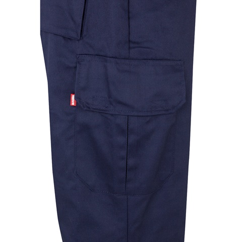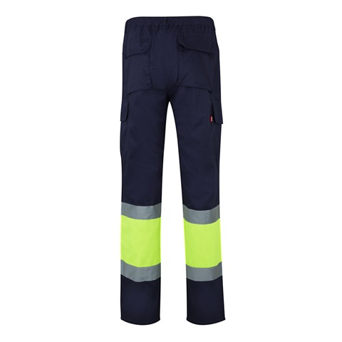 Dvoubarevné vícekapsové keprové kalhoty (210g/m²), z bavlny (20%) a polyesteru (80%). S elastickým pasem a reflexními pruhy na spodní části kalhot. Obsahuje šest kapes (2 francouzské kapsy, 2 boční měchové kapsy a 2 zadní měchové kapsy). Výrobek v souladu s nařízením EU 2016/425, certifikovaný podle EN20471 a třídy č. 1. Velikost: S,M,L,XL,2XL,3XL Reflexní prvky