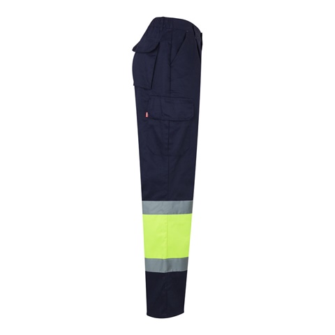Dvoubarevné vícekapsové keprové kalhoty (210g/m²), z bavlny (20%) a polyesteru (80%). S elastickým pasem a reflexními pruhy na spodní části kalhot. Obsahuje šest kapes (2 francouzské kapsy, 2 boční měchové kapsy a 2 zadní měchové kapsy). Výrobek v souladu s nařízením EU 2016/425, certifikovaný podle EN20471 a třídy č. 1. Velikost: S,M,L,XL,2XL,3XL Reflexní prvky