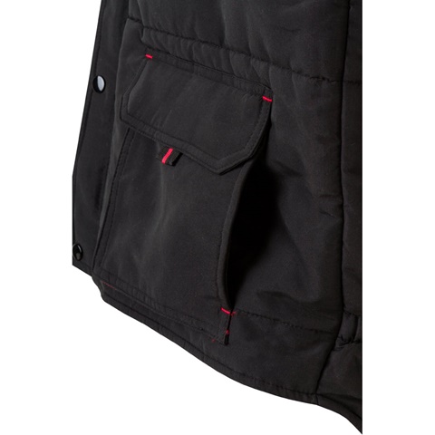 Dvoubarevná, vícekapsová prošívaná vesta (120 g/m²), z polyesteru (100 %). Zapínání na zip, skryté knoflíkovou légou. Elastický boční pas, větrovka u průramku. S měchem, stahováky a prošíváním v kontrastní barvě. Obsahuje sedm kapes (2 měchové kapsy na hrudi, 2 spodní měchové kapsy, 2 boční kapsy, 1 měchová kapsa na hrudi a 1 vnitřní kapsa). Velikost: S, M, L, XL, 2XL, 3XL