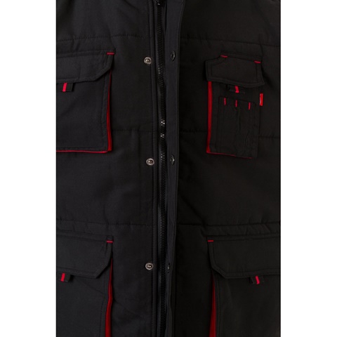Dvoubarevná, vícekapsová prošívaná vesta (120 g/m²), z polyesteru (100 %). Zapínání na zip, skryté knoflíkovou légou. Elastický boční pas, větrovka u průramku. S měchem, stahováky a prošíváním v kontrastní barvě. Obsahuje sedm kapes (2 měchové kapsy na hrudi, 2 spodní měchové kapsy, 2 boční kapsy, 1 měchová kapsa na hrudi a 1 vnitřní kapsa). Velikost: S, M, L, XL, 2XL, 3XL