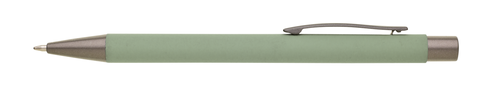 Kovová propiska CAGERI SOFT s hnědo-černými doplňky, se světlou zelenou pogumovanou povrchovou úpravou. Velkoobsahová modrá náplň.
