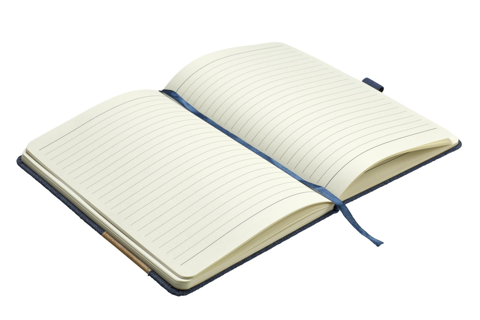 Poznámkový zápisník A5 v deskách v kombinaci tmavě modré denimové látky a PU kůže má 80 linkovaných listů z krémového papíru o hmotnosti 70 g/m2. Blok má poutko na propisku a textilní záložku v modré barvě.