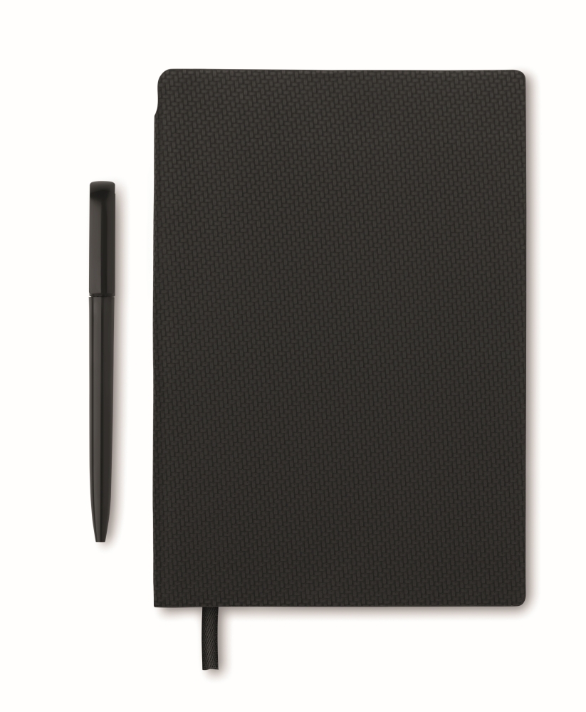 Zápisník formátu A5 v pevných PU deskách se strukturovaným povrchem. Obsahuje 160 recyklovaných linkovaných stran a plastové kuličkové pero s otočným mechanismem uložené uvnitř hřbetu. Rozměry: 14,5 × 1,1 × 21 cm.