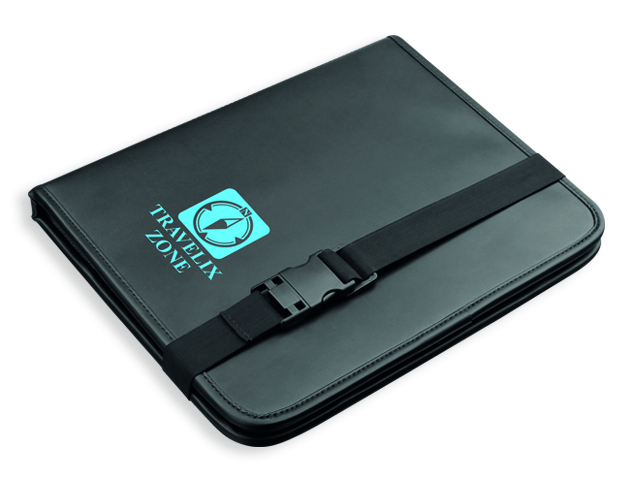 Organizér do auta z imitace kůže s držákem tabletu a elastickým pásem na zavěšení za přední sedačku.