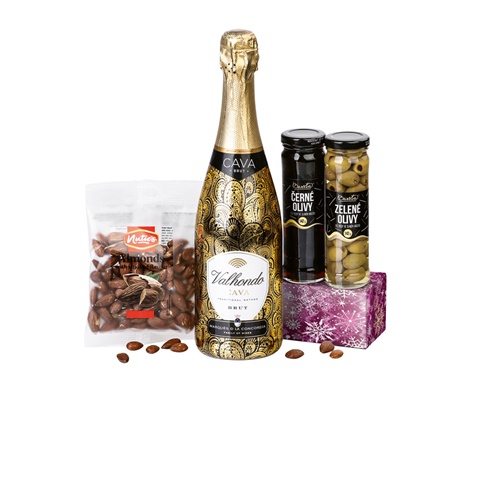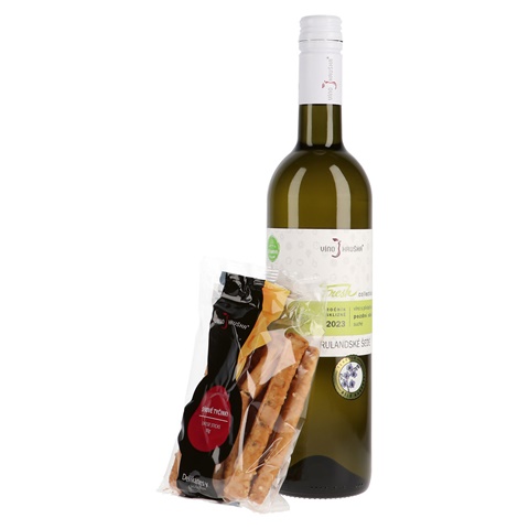 Rulandské šedé (750 m l) a sýrové tyčinky (90 g) v dárkové kazetě. 336 × 86 × 84 mm Vyrobeno v EU