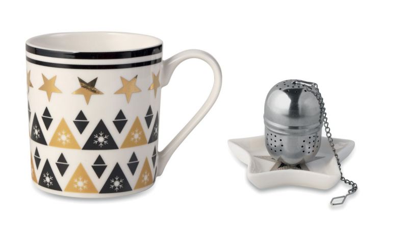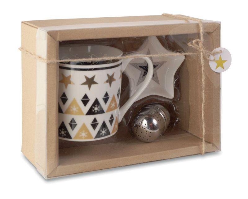 Sada obsahující keramický hrneček, čajítko a mini talířek. Dodáváme v krabičce z kartonu a PVC, převázáno šňůrkou se papírovým štítkem. Rozměry: 21 x 15 x 9,5 cm.