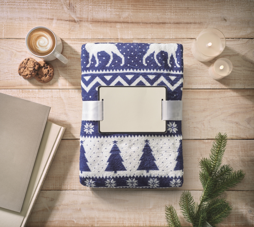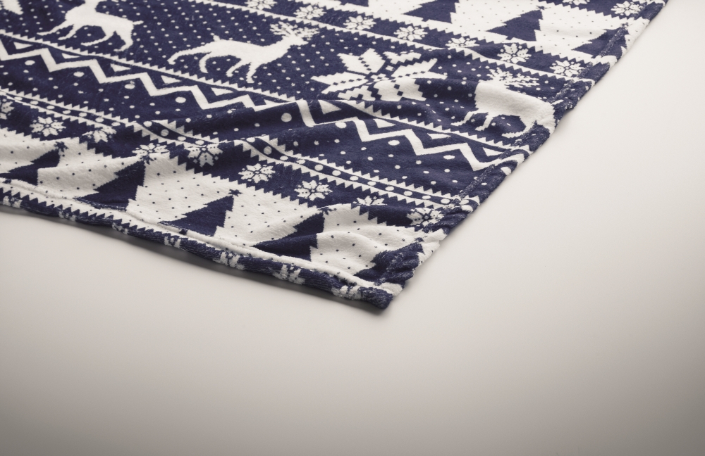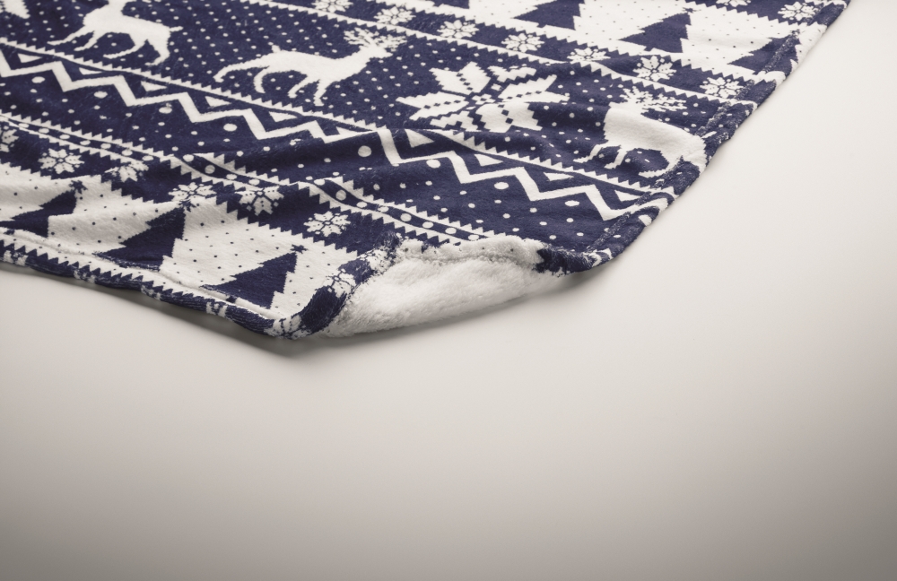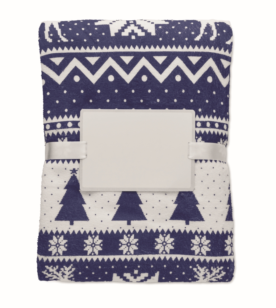 Fleecová deka z RPET 190 gr/m2 se zimním vzorem. Zabalená do stuhy s kartičkou s možností potisku. Rozměry: 150 x 120 cm. Materiál: RPET