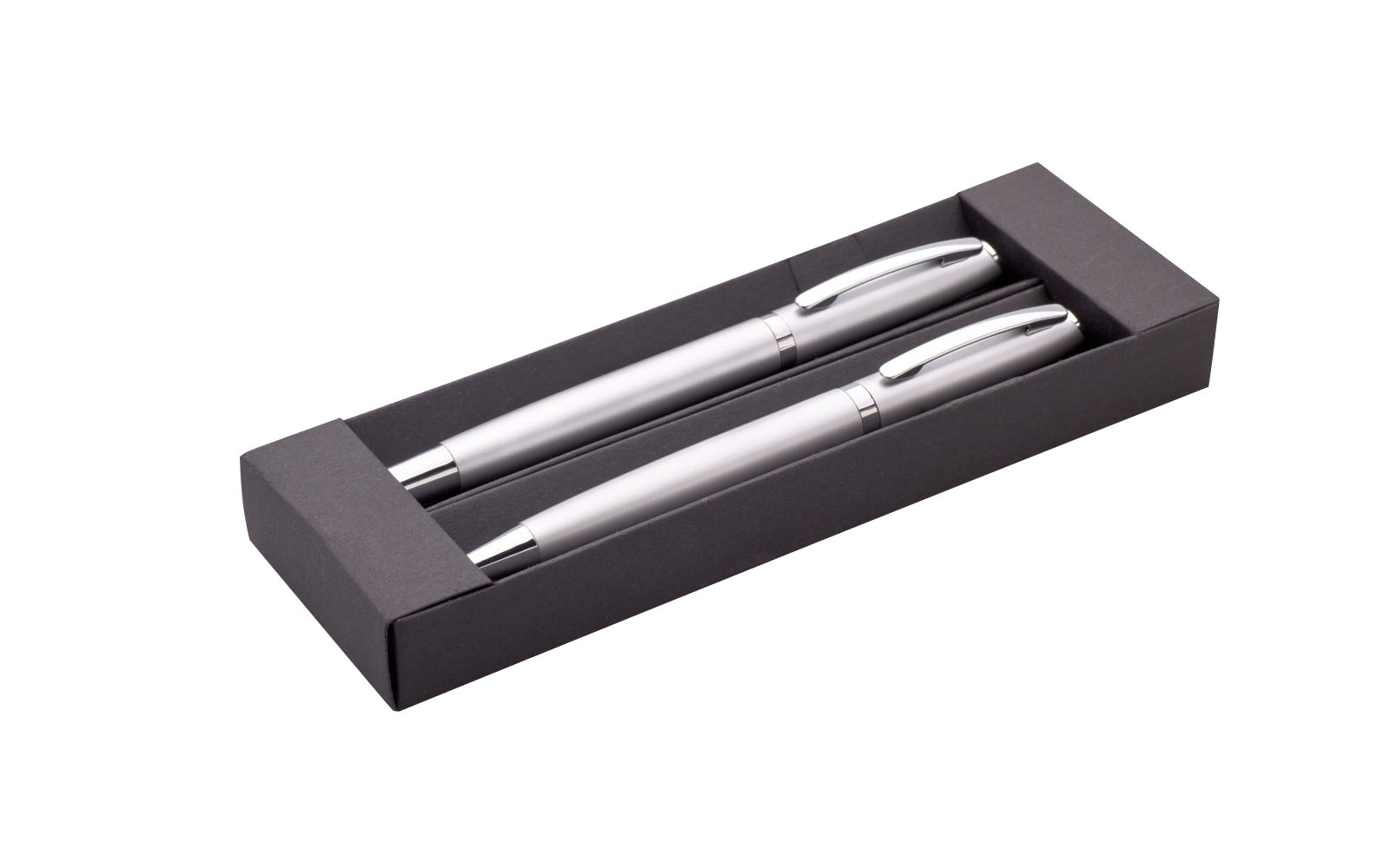 Dárková sada se stříbrnou propiskou a rollerem v černé papírové krabičce.