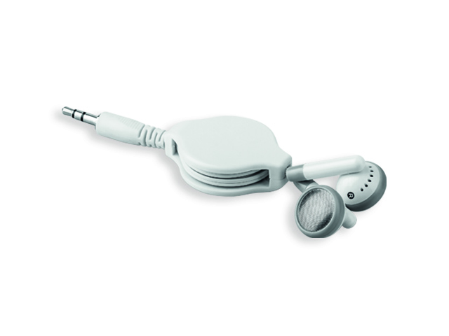 Plastová audio sluchátka se samonavíjecím mechanismem. Maximální výkon 10 mW. Jack konektor 3,5 mm, délka kabelu 0,8 m.