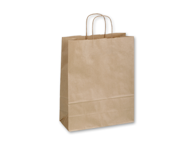 Papírová taška, modrý tisk na hnědém sulfátovém papíře, modré kroucené držadlo. Rozměry: 18 × 8 × 25 cm, 23 × 10 × 32 cm, 32 × 13 × 42,5 cm.