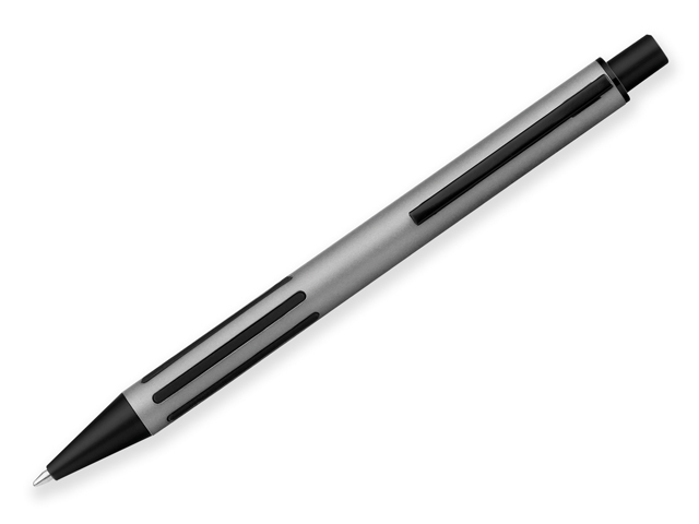 Plastové kuličkové pero s pryžovým gripem, kovovým klipem a modrou náplní.