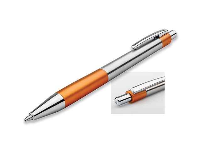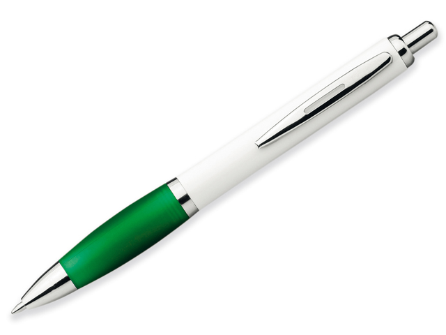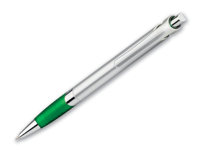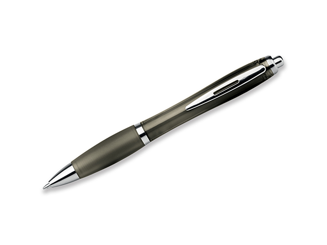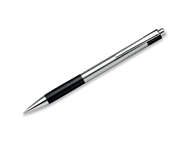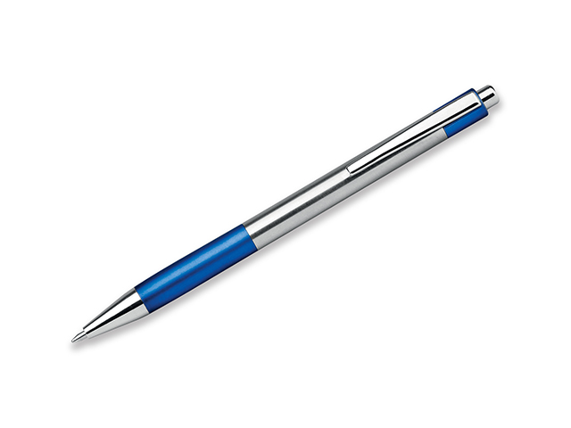 Plastové kuličkové pero s pryžovým gripem, kovovým klipem a modrou náplní.