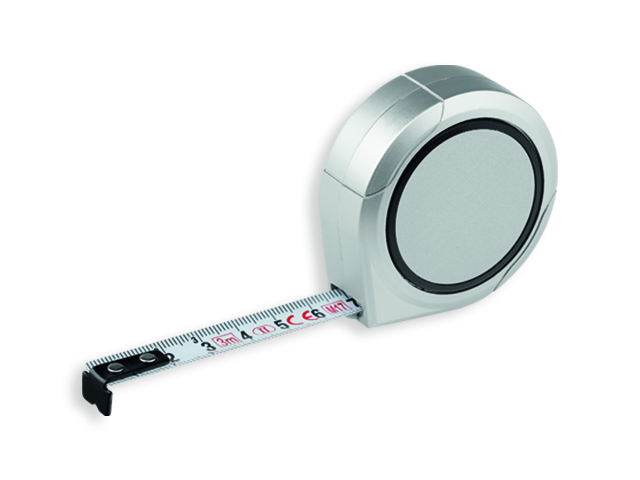 Svinovací metr z plastu a kovu s dotykovou aretací a magnetem, 3 m. Jedná se o reklamní produkt.
