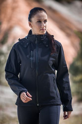 Lehká softshellová bunda zajišťující voděodolnost i větruvzdornost. Má zpevněná ramena, dvě boční kapsy, kapsičku pro skipas či mobil na rukávu. Rukávy jsou zakončené manžetou a mají vypracovaný otvor na palec. Bunda má kapuci v límci s možností stahování, s kšiltem a ochrannou protivětrnou légou na obličej. Logo Schwarzwolf vzadu za krkem. Materiál: 96% pongee polyester, 4% spandex polyester. Výška vodního sloupce v ploše: 20000 mm, prodyšnost: 3500 g/m2/24 hod. Doporučená technologie tisku: sítotisk S3, výšivka