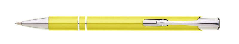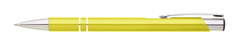 ALBA je velmi oblíbená hliníková reklamní tužka . Matné jasně žluté tělo se dvěma stříbrnými proužky a chromovými doplňky. Velkoobsahová modrá náplň.