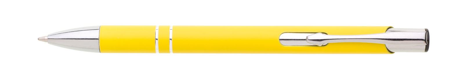 Hliníková propiska se stříbrnými doplňky a měkkým pogumovaným soft povrchem v žluté barvě.