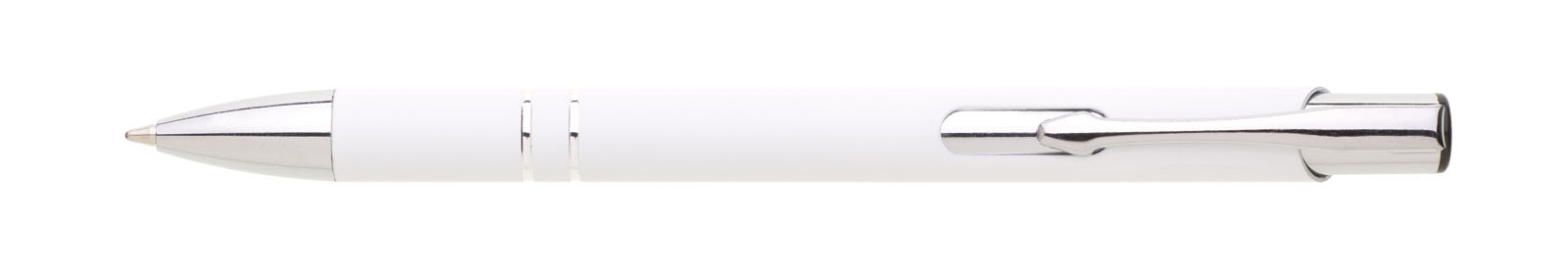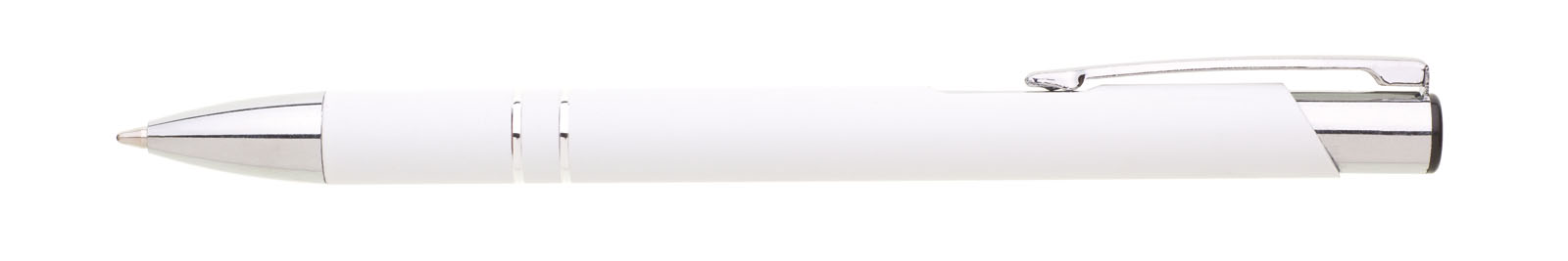 Hliníková propiska se stříbrnými doplňky a měkkým pogumovaným soft povrchem v bílé barvě.
