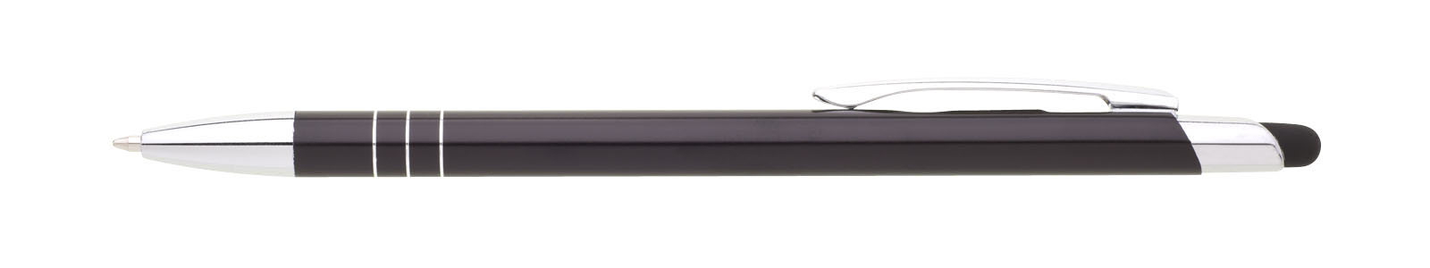 Tenká kovová propiska SOTTI s touch koncem v černé barvě s chromovými doplňky a třemi tenkými proužky. Náplň X-20, modře píšící.
